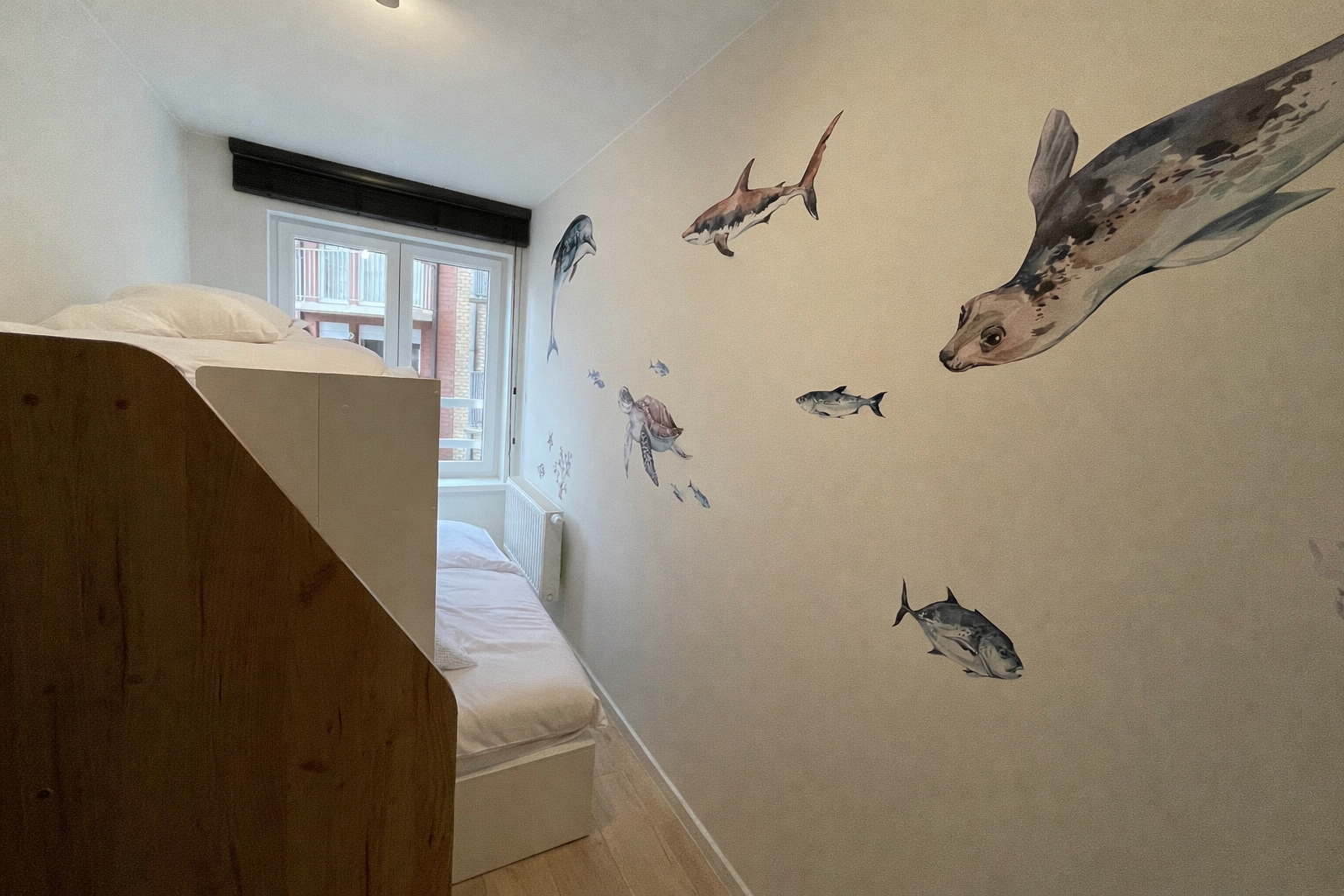 Het appartement beschikt over twee slaapkamers en biedt plaats aan maximaal 5 personen. De eerste slaapkamer heeft een dubbel bed, terwijl de tweede kamer voorzien is van een stapelbed met een ruime twijfelaar onderaan. Een babybed is eveneens beschikbaar, waardoor het appartement ideaal is voor een gezin. De badkamer beschikt over een douche en wastafel, en er is een apart toilet.